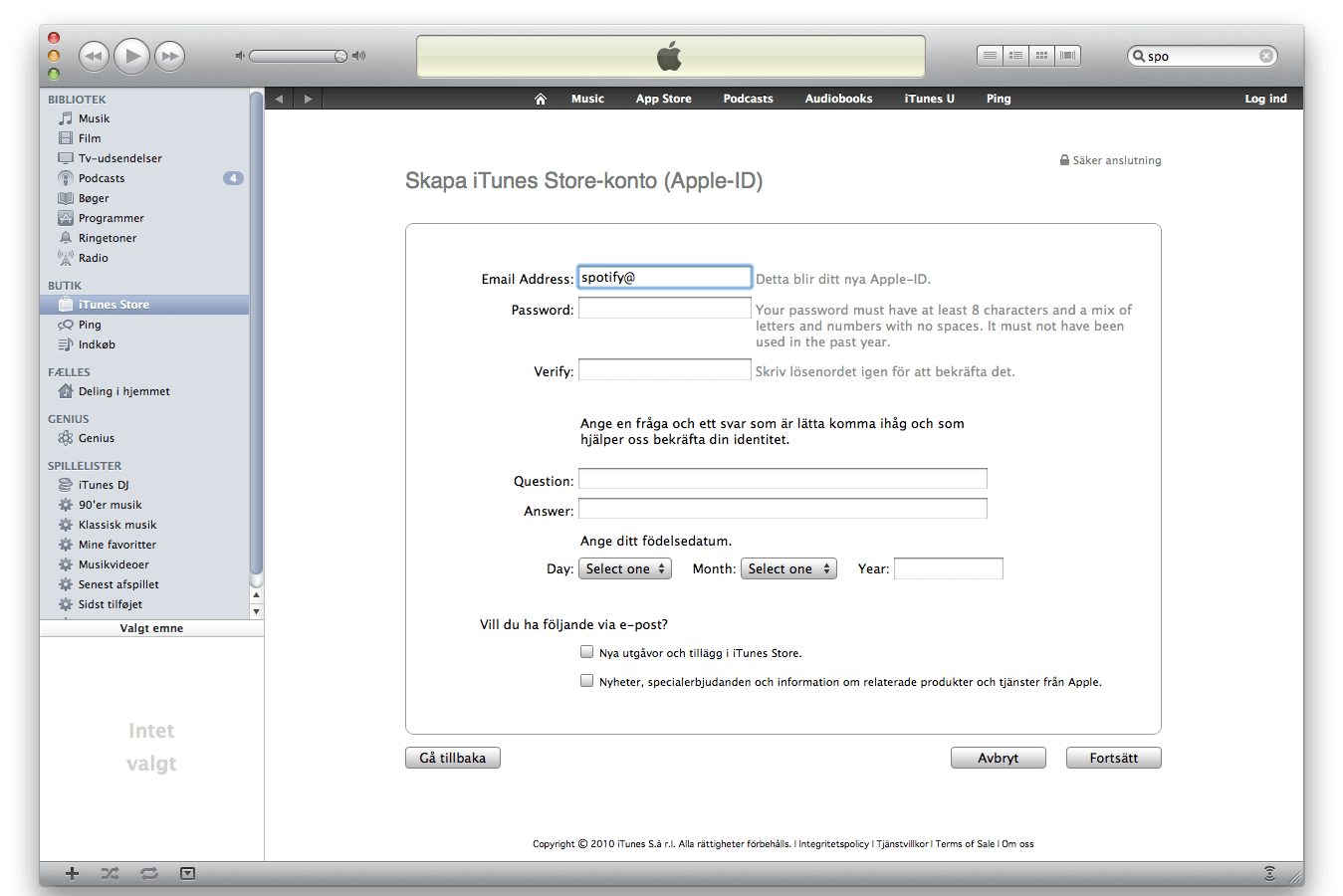 8. følg itunes guiden og skriv en ny mailadresse som du ikke har bruge i itunes før. Brug en adresse og telefonnummer fra sverige. (denne konto vi opretter skal vi kun bruge 1 gang til at downloade og evt opdatere Spotify-app’en i fremtiden. så husk din kode og login.
