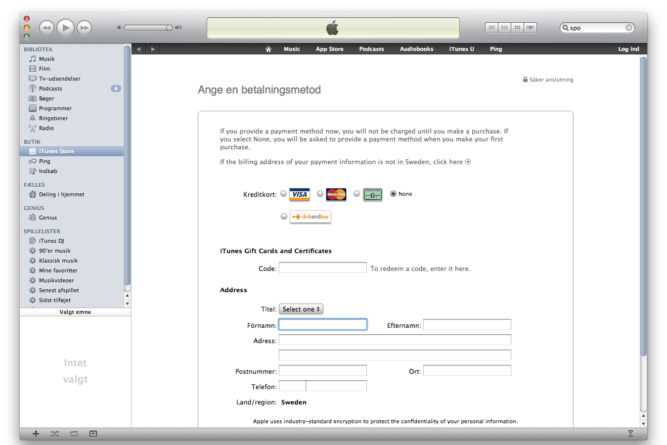 7. ved betalingstype skal du vælge “None”. I den amerikanske og danske itunes store kan man ikke vælge none… så du skal ind i den svenske hvis ikke “none” valget findes…