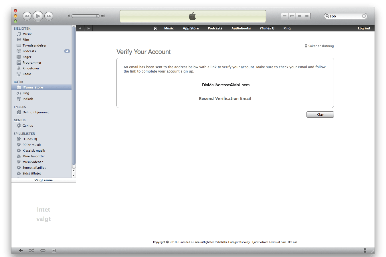9. efter oprettelsen af ny konto med en anden emailadresse end du plejer at bruge, skal du gå ind og tjekke din mail og du har modtaget en mail fra itunes sweden hvor du skal verificere dig og din mailadresse ved at klikke på linket og logge ind på itunes.